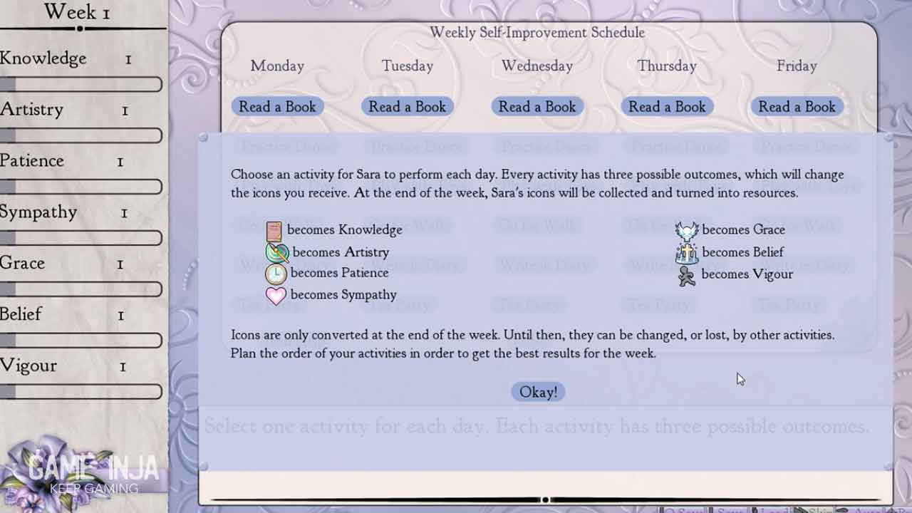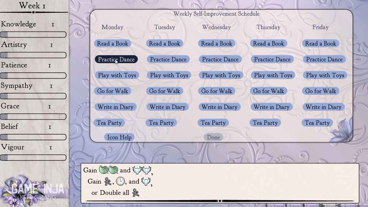 مهمترین قسمت بازی که آن را از بقیه بازی های رمان-کلیکی جدا می کند قسمتی از بازی است که آن را به داشتن گیم پلی کمی متمایل می کند. در قسمتی که جدول برنامه ریزی بازی قرار داده شده است می توانید ببینید که بازی کارکتر های خودش را دسته بندی کرده است. با بالا بردن سطح توانایی هر بازیکن در بازی می توانید به داستان های جدیدی که آن شخصیت می تواند در بازی رقم بزند دسترسی داشته باشید. اما مشکل اصلی بازی در قسمت گیم پلی را باید در حالتی بدانیم که این افزایش قدرت ها در اصل تغییری در بازی ایجاد نمیکنند. همچنین مشکل دیگر این است که نمی دانید بالا بردن قدرت های هر شخصیت تا چه مقداری برای او مناسب است. هیچ راهنمایی در بازی قرار داده نشده است که بگوید برای دسترسی به قسمت دیگر رمان های شخصیتی مثل Yakri باید چه قابلیت از آن را به بالاترین حالت برسانیم. بازی از زمانی گیج کننده تر می شود که مشغول بالا بردن برخی از قابلیت های شخصیت ها می شوید ولی در اصل برای داستان های آن ها اصلا نیازی نبوده است که این مقدار وقت بگذارید و کارکتر ها را تقویت کنید که در نوع خودش امتیاز منفی در بازی A Little Lily Princess تلقی خواهد شد.