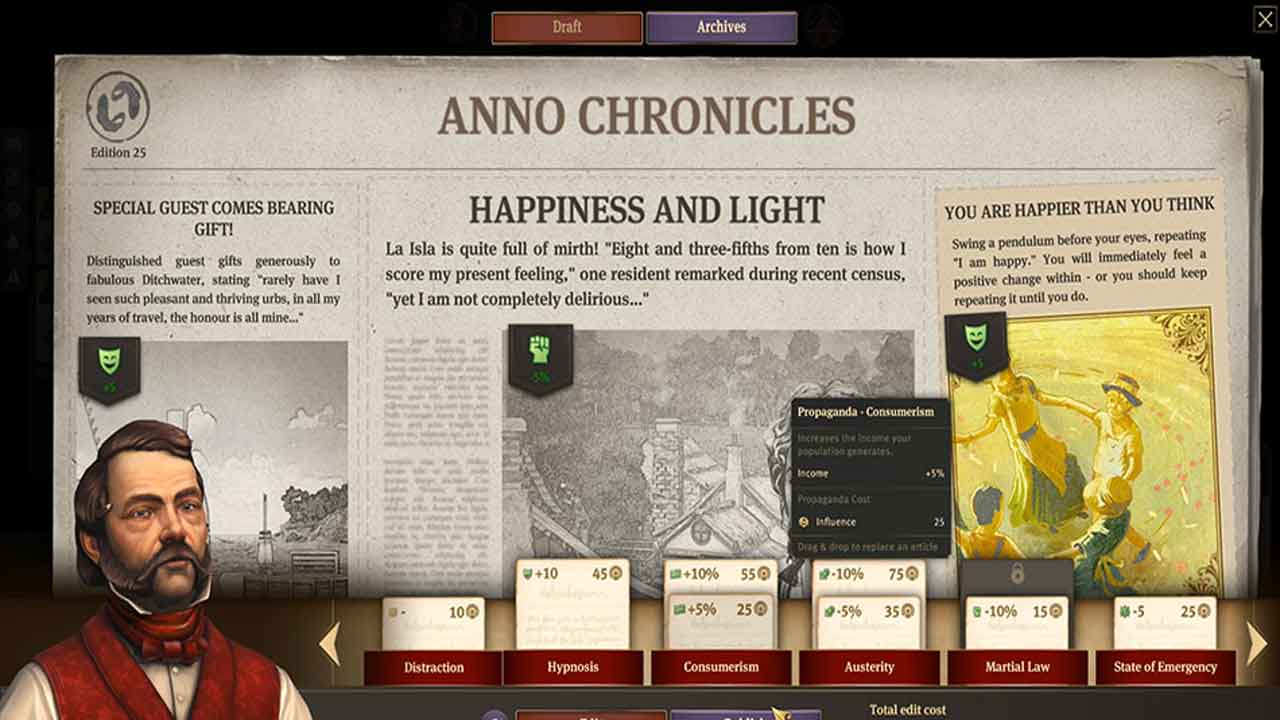 برای اینکه گیم پلی بازی روند تکراری به خود نگیرد، سازندگان محتویات مختلف و بسیار زیادی در بازی جای داده‌اند که کاربران برخی مواقع به هیچ وجه احساس نمی‌کنند که در حال انجام یک بازی شهرسازی هستند. مأموریت‌های معمایی در جریان بازی به سراغ شما می‌آیند که به‌طور مثال شما را وادار می‌کنند که در شهرتان زوم کنید و به‌دنبال سگ گم‌شده‌ای باشید. البته این تنها بخش کوچکی از محتویات سرگرم‌کننده این بازی است. برخی مأموریت‌های مختلف در بازی وجود دارند که شما باید با دستورهای خود ملوانان را در حین جنگ راهنمایی کنید. شما درواقع روند جنگ ملوانان را مشاهده نمی‌کنید و این موضوع با نامه‌هایی که به دستتان می‌رسد پیگیری می‌شود. شما تنها با خواندن نامه و کلیک روی تصمیم‌های مختلف می‌توانید یک گیم پلی متفاوت را تجربه کنید. همچنین باید در نظر داشته باشید که هر از چند گاهی به سردبیر روزنامه شهرتان نیز سر بزنید و تیترها را چک کنید و از انداختن ترس در دل شهروندان خودداری کنید؛ چرا که این موضوع باعث می‌شود که شهروندان از زندگی در شهرتان راضی نباشند و درآمد شهر شما کاهش پیدا کند.