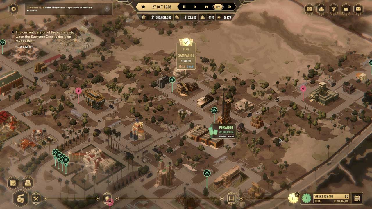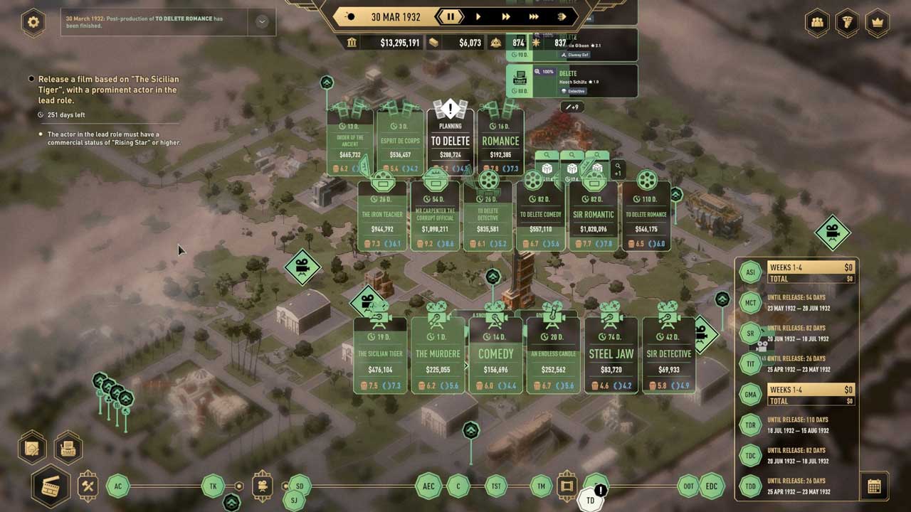 علاوه بر این، تحقیق در مورد فناوریها و مهارتهای جدید سالهای زیادی را در بازی طول خواهد کشید و اگر در مورد موارد مناسب تحقیق نکنید، اساساً ضرر شما تضمین شده است. برای مثال، اگر فراموش کنید که باید در مورد توانایی تعمیر تحقیق کنید (مشکلی که من در اولین تجربه بازیام با آن مواجه شدم)، متوجه خواهید شد که در نهایت تمام ساختمانهای شما خاموش میشوند و حالا باید ۵۰۰ روز در بازی صبر کنید تا آن را تحقیق کنید، زمانی که ورشکست شدهاید. به طور مشابه، اگر تا زمانی که بخش آموزشی تمام شود، تحقیق در مورد تبلیغات را تمام نکنید، فیلمهای شما تا زمانی که آن را تمام نکنید، نمیتوانند به بازار عرضه شوند.