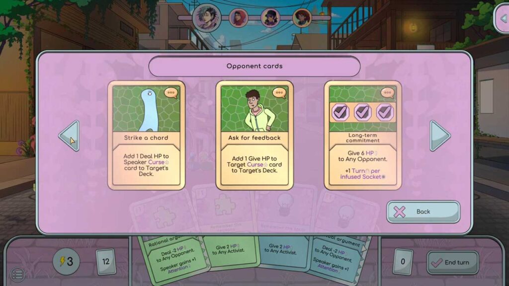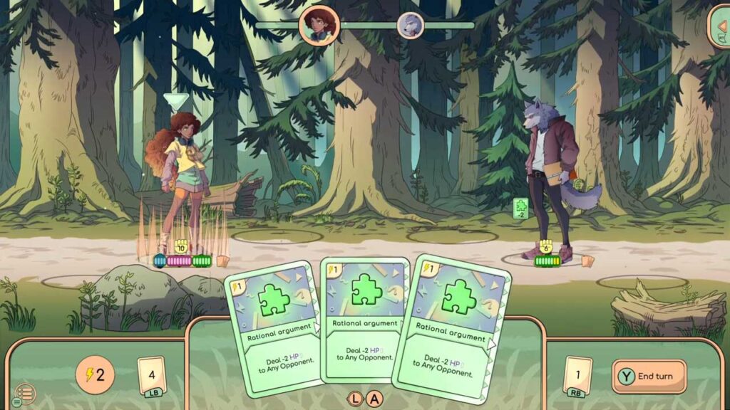 در مجموع هفت شخصیت قابل باز شدن وجود دارد و اینجاست که عنصر ساخت دسته کارت که توسط KreatureKind ارائه میشود را میبینیم. ما با یک دسته کارت کار نمیکنیم؛ هر عضوی که برای تیم مناظره خود انتخاب میکنیم، کارتها و سبک بازی خاص خود را دارد. سه شخصیت اولی که در اختیار داریم، نمونهای از یک تیم متعادل هستند. شخصیت اصلی، رایلی، تعادل خوبی بین دفاع و حمله دارد، با گزینههای آسیبرسانی و کارتهای پشتیبانی که به او اجازه میدهد حتی در صورت حمله، HP حریف خود را کاهش دهد. Yui، اثر فعال دوم، در ایجاد اثرات منفی بر حریف و بیفایده کردن کارتهای او تخصص دارد و تجهیزات تیم را کامل میکند و بر تولید سپر و ارائه پشتیبانی مداوم به همتیمیهای خود تمرکز دارد.