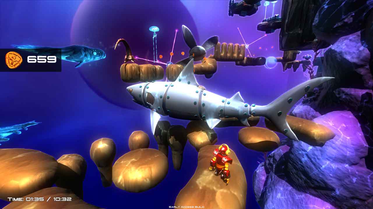 در گیم پلی بازی Rogue Singularity امکان اکتشاف در محیط برای بازیکنان فراهم شده است. اکتشاف در محیط بازی، حرکات کاراکتر بازی و توانایی های متفاوت آن بسیار جذاب طراحی شده اند. در نزدیکی دستگاه انتقال نیرو در ابتدا چند گره مختلف وجود دارد. یکی به شما امکان می دهد قطعاتی را برای روبات خود با تراشه های طلا بخرید که می توانید آنها را در طول گیم پلی بازی بدست آورید. در کنار آن گره دیگری قرار دارد که به شما امکان دسترسی به یک فروشگاه را می دهد. شما می توانید توانایی های خود را خریداری کنید و یک بار از مواردی استفاده کنید که می توانند در سفر به شما کمک کنند. یک گره دیگر نیز وجود دارد که به شما امکان می دهد از بخش آنلاین چالش ها و مسابقات روزانه را بررسی کنید.