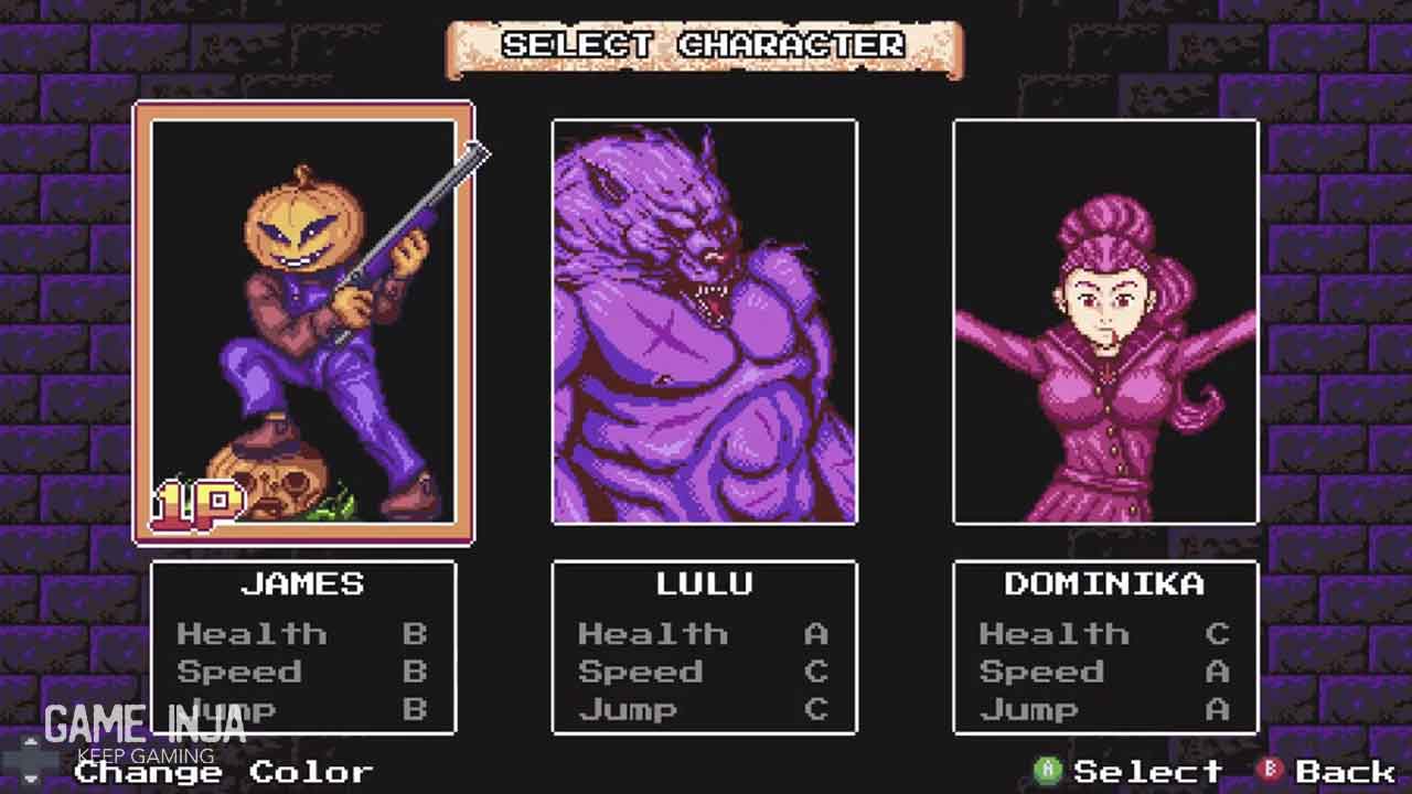 بازی دارای سه شخصیت مختلف می باشد که بازی با هر کدام با ویژگی های خاص خودش همراه است و حتی گیم پلی با آنها نیز متفاوت می شود. جیمز که یک شخصیت انسان است که با کدو تنبلی که بر روی سرش دارد و با اسلحه اش می تواند در مسیر بازی دشمنانش را نابود سازد. از طرف دیگر یک گرگینه نیز به نام لولو در بازی ساخته شده است که با قدرت بدنی اش نیز می تواند بر روی سر دشمنان در بازی بپرد. در آخر هم شخصیت دومینیکا در بازی با قدرت جادویی خودش می تواند با دشمن مبارزه کند. حال داستان بازی درباره شخصی به نام جمین است که او الهه هالووین محسوب می شود ولی امسال با یک طلسم سعی دارد که هالووین را برای انسان ها همیشگی کند و بتواند خفاش ها و موجودات پلید را بر روی زمین نگه دارد. در همین راستا سه شخصیت اصلی بازی با اون مخالفت می کنند وسعی می کنند که تمام افرادی که در دنیای زیر زمین آماده هستند که دوباره بعد از هالوین به سمت زمین حمله کنند را نابود سازند و با شخصیت اصلی منفی داستان نیز مبارزه کنند.