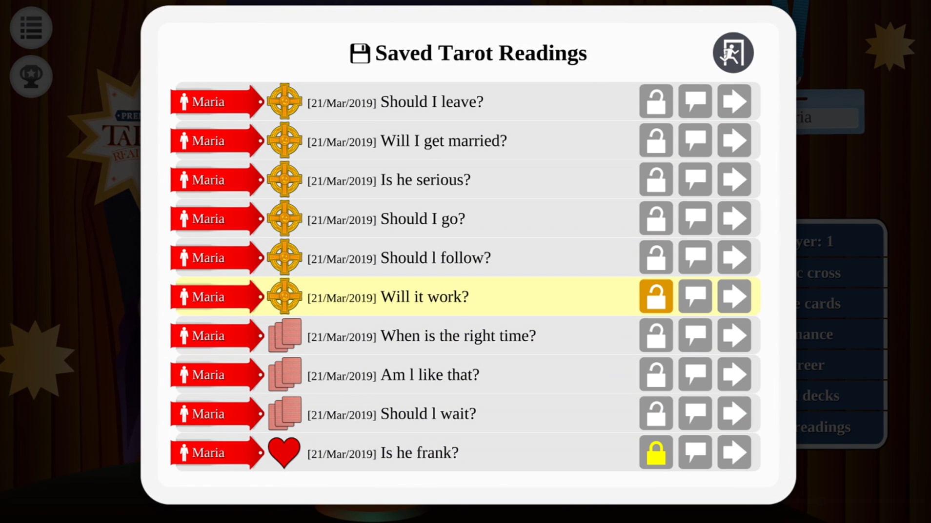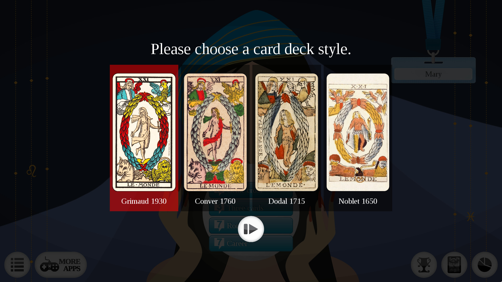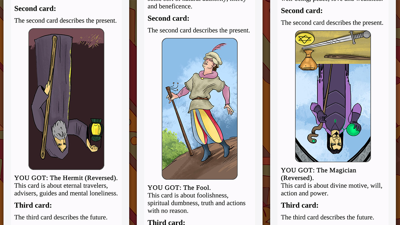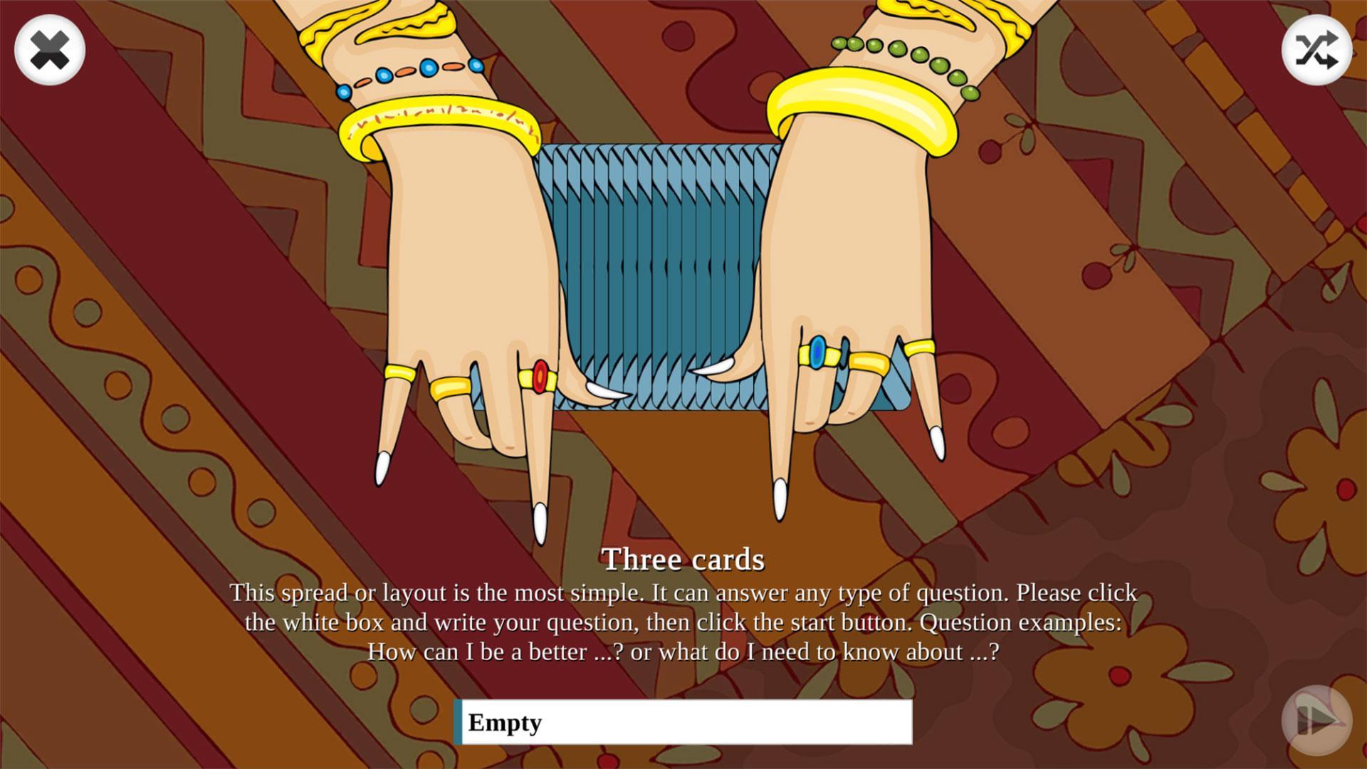 حالت دوم بازی نیز بخش سه کارت به امتیازات است. حالت سوم نیز هفت کارت پخش شده است که به موضوعات عاشقانه و دیگری برای حرفه و شغل اشاره دارد. در حالت سلتیک بازی هنگامی که سؤال خود را ارائه می کنید ، ده کارت تصادفی را از یک میز که روی آن هفتاد و هشت کارت قرار دارند ، انتخاب کرده و آنها را در یک صلیب سلتیک قرار می دهید