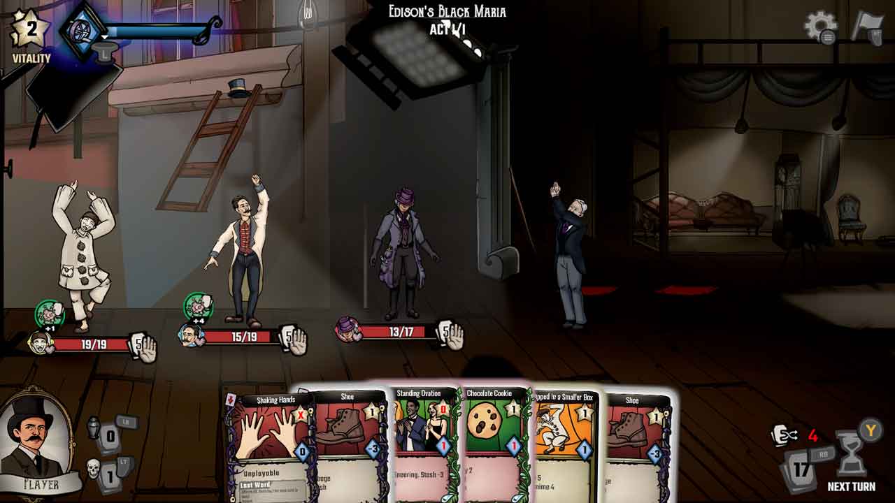 و اما گیم پلی بازی که این نیز برایم اهیمت فراوانی دارد.بازی با یک آموزش ساده شروع میشود و تمام مکانیزم های گیم پلی را مو به مو توضیح میدهد.برای کسانی که بار اولشان است که یک بازی کارتی را تجربه میکنند،بخش آموزشی آن لازم و البته کافی است.مانند هر بازی کارتی دیگری،بازی به شما زمان و امتیازی برای برای حمله و دفاع از خود میدهد.حمله های شما با اجرا کردن حرکات نمایشی انحصاری هر کاراکتر انجام میگیرد و باید باعث شود تماشاگر شروع به تشویق کردن شما کند.دفاع شما نیز به صورتی است که باید با قرار دادن مانعی جلوی کاراکتر هایتان که در هر مرحله 3 نفر هستند،از نارضایتی های تماشاگران و پرتاب میوه و وسایل به آن ها محافظت کنید.در زیر هر کاراکتر و هر تماشاگر نواری مشاهده میکنید.در کاراکتر های شما آن نوار میزان تحمل کاراکتر نسبت به نقد های تماشاگران و پرتاب میوه هارا نشان میدهد که شما آن را همان نوار جانتان در نظر بگیرید.در تماشاگر نیز تقریبا شبیه به کاراکترهایتان است با این تفاوت که این نوار برعکس نوار خودتان،باید خالی شود تا شما به پیروزی برسید.اما بازی در اینجا گیم پلی را رها نکرده است و مکانیزم های دیگری را نیز رو میکند!مانند اجرای فاینال که قدرتش نسبت به اجرا های عادی بیشتر است اما باید معایب و مزایا آن نیز دقت کنید.سیستم گیم پلی بازی پخته و واقعا عالی است و شما میتوانید با ارتقا دادن قدرت هایتان از پس چالش ها بر بیایید.نسبت به تمام قسمت های بازی،گیم پلی آن در سطح دیگری قرار دارد و عالی کار شده است.