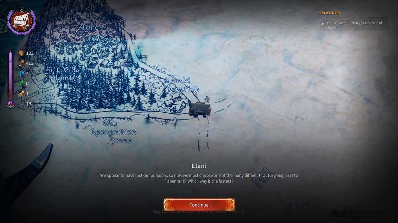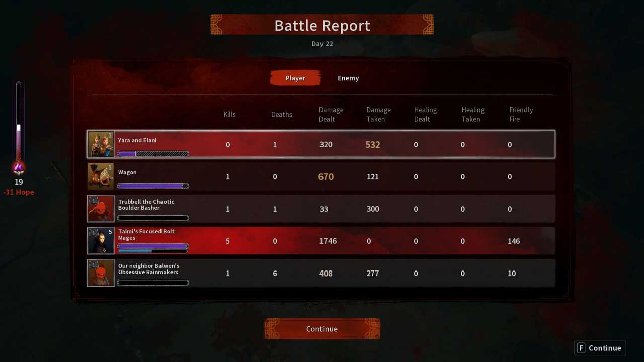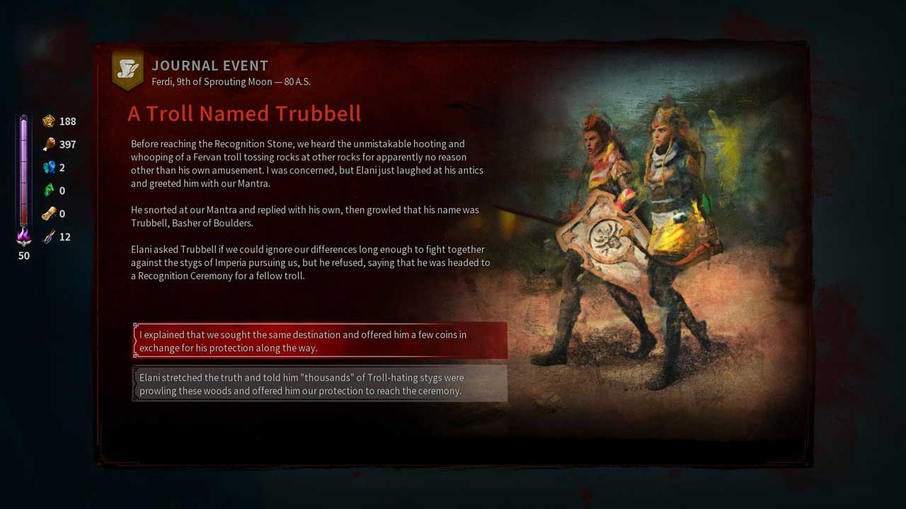ماجراجویی اصلی شما با حرکت کاروان در سرزمینهای بازی آغاز میشود و از طریق یک نقشه وسیع هدایت میشوید. این بخش، سبک سفر سری Pathfinder را تداعی میکند، با برخوردها و رویدادهای تصادفی که سفر شما را شکل میدهند. Wartorn در اینجا سعی میکند روایتی هدایتشده توسط بازیکن ارائه دهد و انتخابهایی را در رویدادها و پیامدهای آن تصمیمات ارائه میدهد. اگر یک نقص قابل توجه وجود نداشت، این میتوانست یک تناسب زیبا برای یک بازی روگلایت باشد: رویدادها واقعاً تصادفی نیستند. در طول اجرای اول، دوم یا حتی چهارم، جادههای ناشناخته، برخوردها و رویدادهایی را با حس کشف تازه ارائه میدهند. با این حال، مرور مجدد یک مسیر آشنا، حس قریب به اتفاق دژاوو را برمیانگیزد.