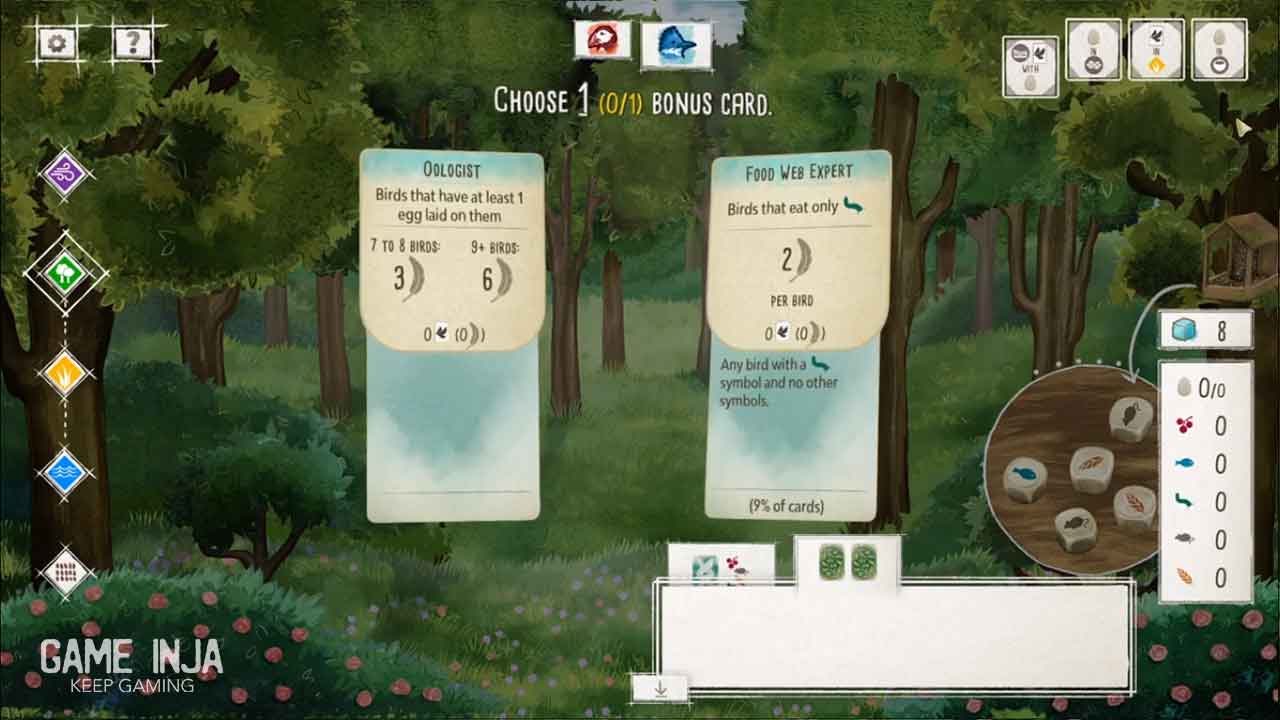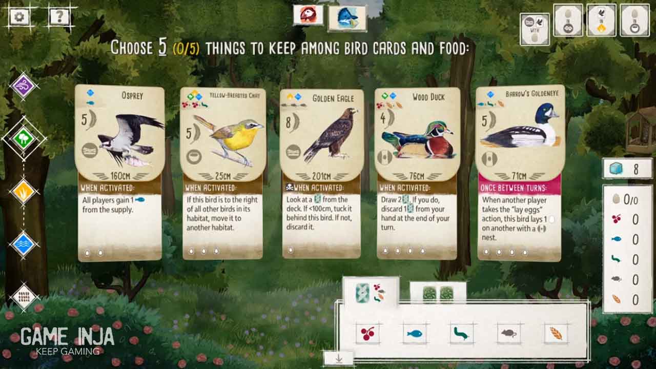 - محیط اول بازی مربوط به جمع آوری غذا می باشد. بر اساس کارت ها و پرنده هایی که در اختیار شما قرار می گیرد باید بتوانید تا جایی که ممکن است غذا های فصل پرنده خودتان را جمع آوری کنید